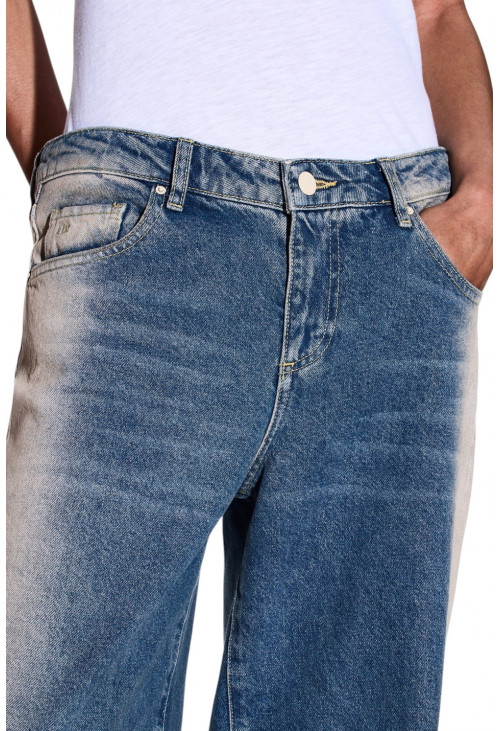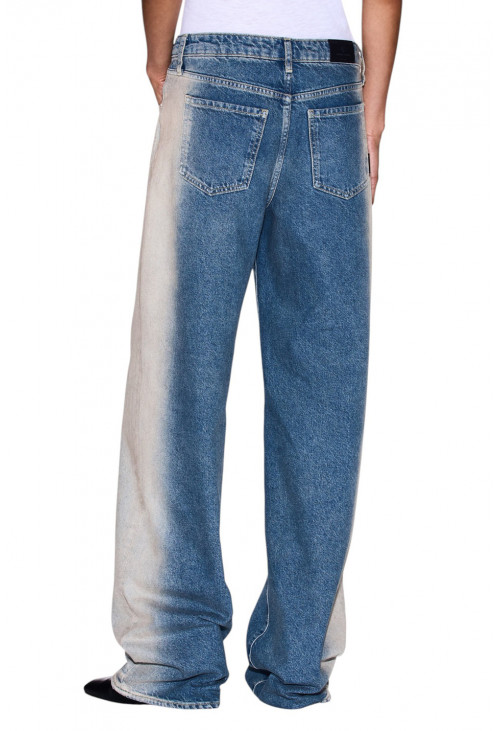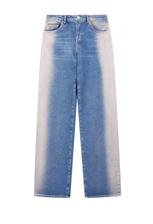 Джинсы свободного кроя из хлопкового денима с характерным вертикальным эффектом потертости, который плавно переходит от тёмно-синего цвета к центру штанины, создавая уникальный визуальный контраст. Пять карманов и застёжка на пуговицу и молнию делают их практичной и модной вещью, идеально подходящей для повседневного и современного образа.