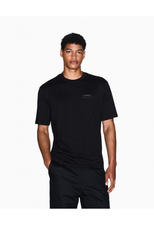 Футболка с короткими рукавами из лёгкого хлопка, выбранного за мягкость, комфорт и воздухопроницаемость, идеально подходит для тёплой погоды. Гладкая текстура и свободный крой обеспечивают приятные ощущения для кожи и создают чёткий силуэт. Металлическая аппликация логотипа на груди и принт на спине добавляют характерный и современный штрих, делая эту футболку незаменимым предметом функционального и модного гардероба.