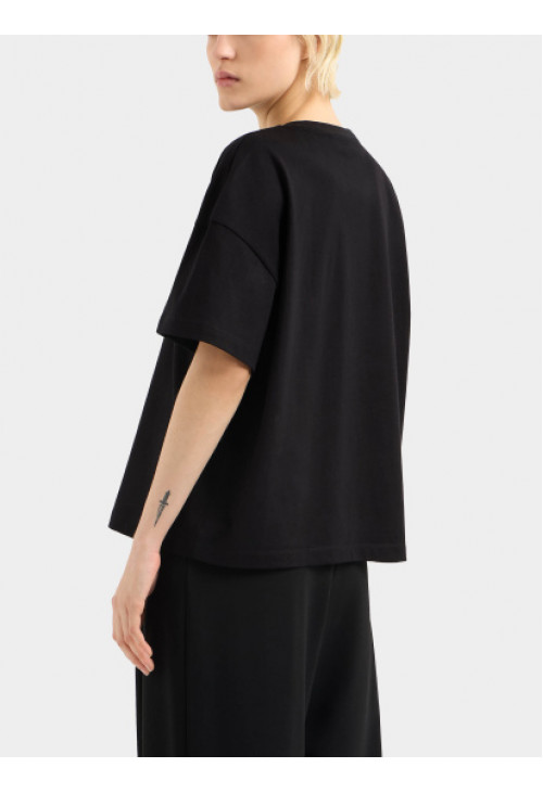 Свободная футболка из плотного хлопка, идеально подходящая для современного и повседневного образа. Логотип спереди добавляет отличительный штрих. Короткие рукава обеспечивают удобную и универсальную посадку. Эта футболка идеально подходит для сочетания с брюками или юбками с высокой талией, создавая модный и повседневный образ.