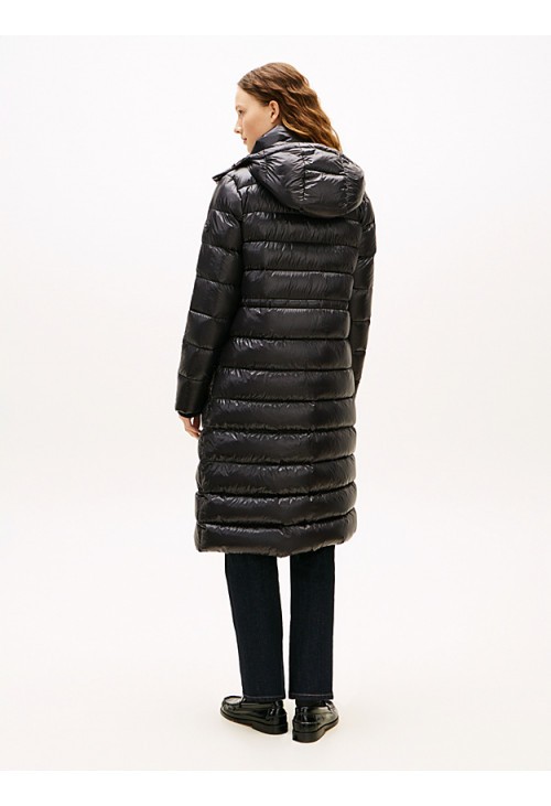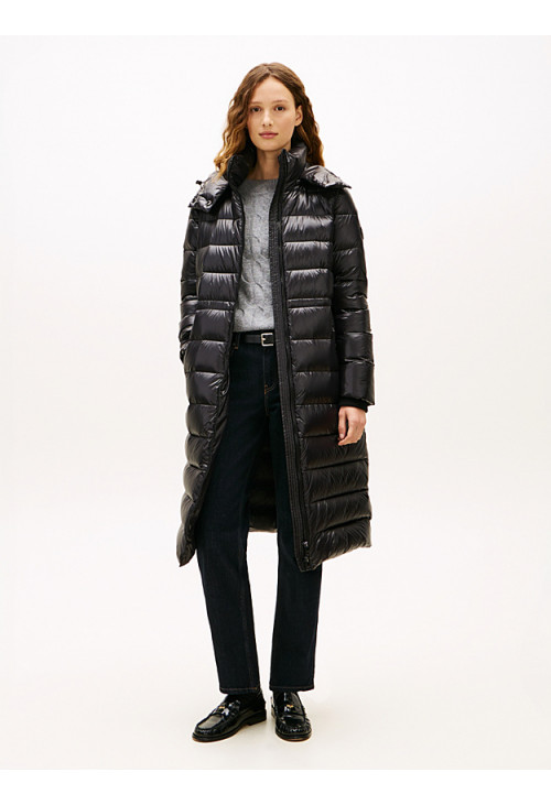 Создайте максималистичный образ для холодной погоды в этом роскошном пуховом пальто с удлиненным силуэтом и блестящей водоотталкивающей отделкой.