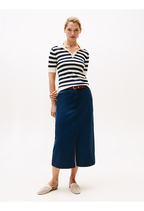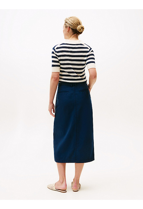 Эта юбка миди из хлопковой смеси сочетает в себе женственный облегающий крой с классическим стилем чинос, что делает ее идеальной для элегантно-повседневных образов. Основные моменты • Смесь хлопка • Застежка-молния с пуговицами • Разрез спереди • Два боковых накладных кармана • Два прорезных кармана сзади • Брендинг Tommy Hilfiger • Вышитый флаг Tommy Hilfiger на спине